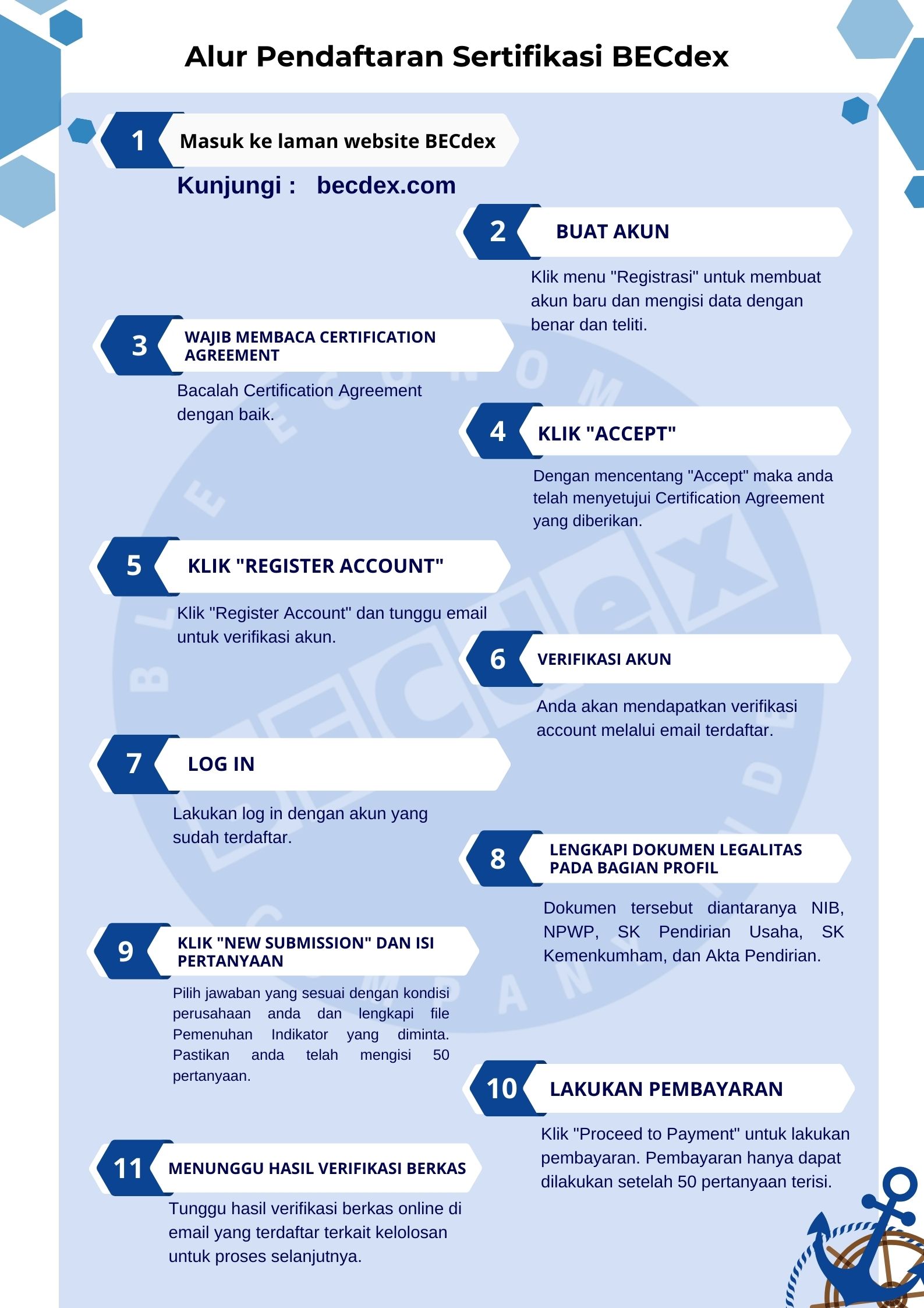Компании должны зарегистрироваться, чтобы создать учетную запись, пройти процедуру сертификации, предоставив необходимую документацию для квалификации, а затем оплатить сумму сертификации в размере 2980 долларов США. После оценки и проверки компании будет выдан электронный сертификат с оценкой «Стандарт» (оценка: 70–78), «Хорошо» (оценка: 80–88) или «Отлично» (оценка: 90–100) Blue Economic Company.
